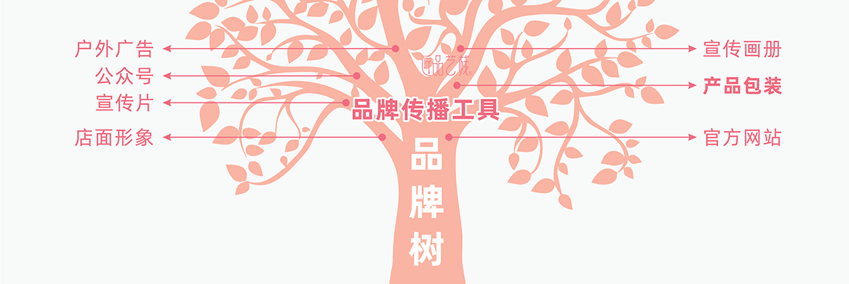 从品牌树的结构中,我们可以看到产品包装只属于其中的枝干部分,想让品牌枝干得到更好的成长,从而连接、生长出茂盛枝叶,带动品牌这棵大树成长。