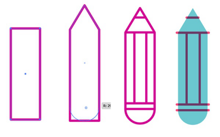 让我们创建一个彩色铅笔图标?;桓鼍匦?。在顶部边缘添加一个锚点,然后使用直接选择工具将其向上拉。通过向内拉动角,将矩形的底部四舍五入。添加垂直和水平线段以创建铅笔的详细信息和部分。