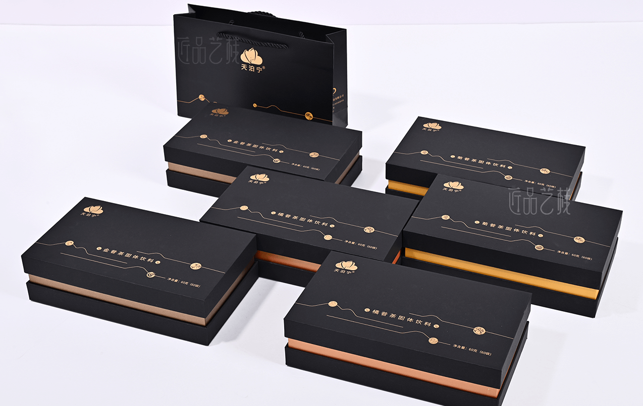 天泊宁茯苓普洱茶粉固体饮料品牌,选用云南高海拔优质大叶种普洱茶、上等优质茯苓为原料,经现代生物技术加工而成。在其系列产品包装盒设计印刷中,匠品艺栈采用普洱茶的黑色为统一主色,并根据不同产品分类采用不同颜色腰条为区分,使其整个系列产品包装盒,既能形成统一的品牌视觉形象,同时又区分出鲜明的产品特色。