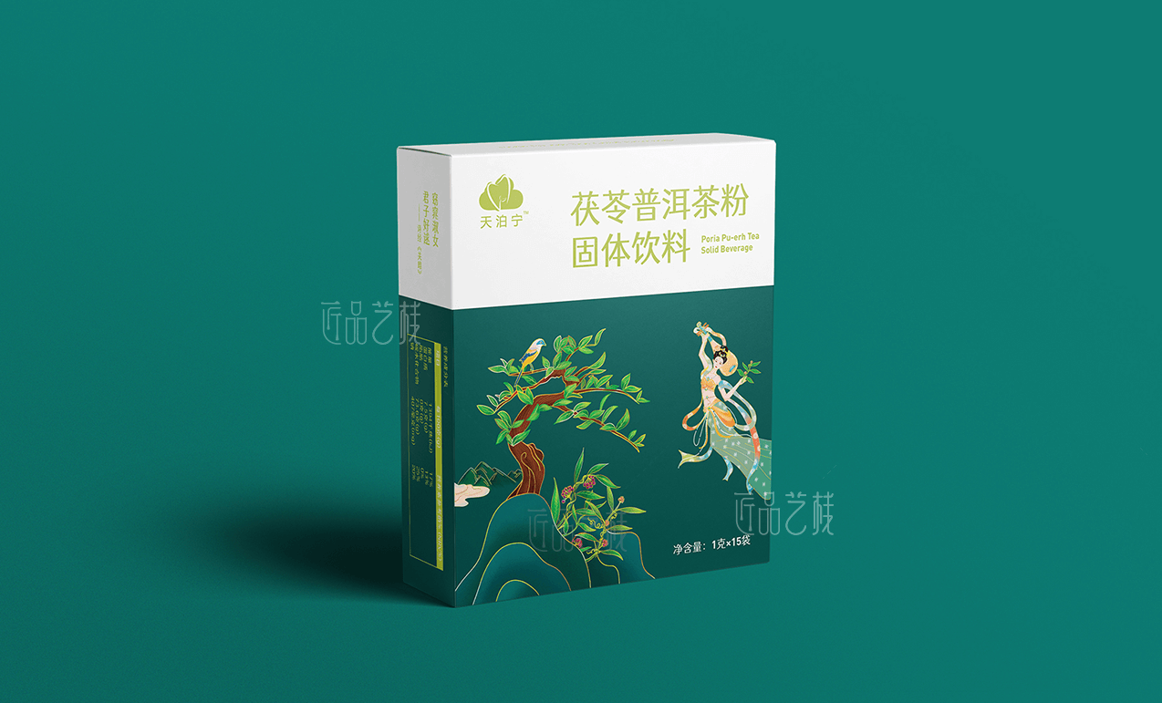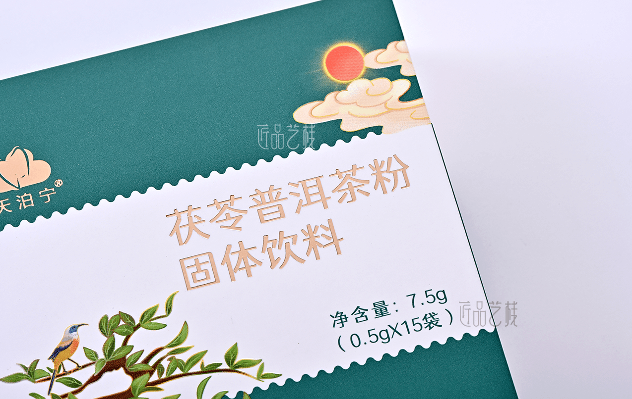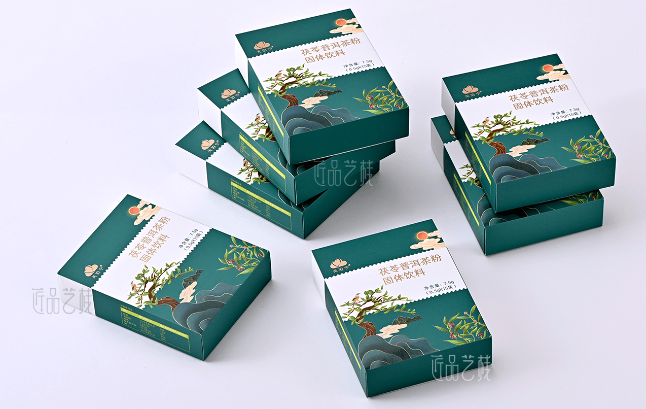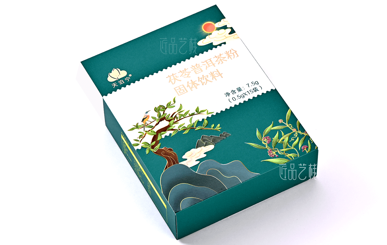 天泊宁普洱茶粉固体饮料,经现代生物技术加工,科学保留普洱茶和获苓的有益成分科学配比,是一款真正原生态、时尚快捷、创新型健康固态饮品。在该品牌包装盒设计中,我们采用原创插画方式设计,搭配进口特种纸卡纸,及精制的表面和成型工艺;打造又一款从设计到印刷整体方案解决优秀包装盒定制案例。