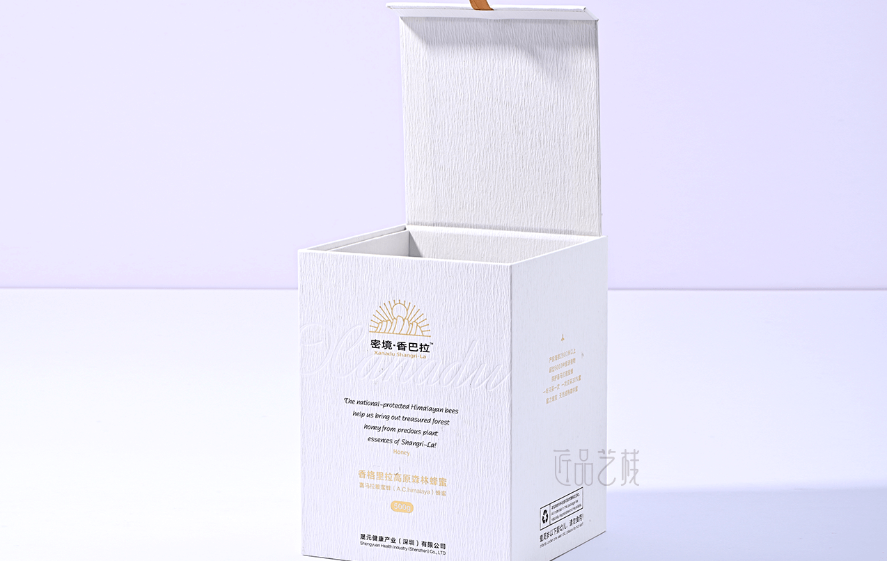 香巴拉品牌蜂蜜,甄选海拔3600米以上的香格里拉深林天然蜂蜜,在其包装盒定做中,采中纯白为底色,衬托其天然、纯净的蜂蜜品质;同时点辍烫金等印刷工艺,使该品牌包装盒呈现出简而不凡的气质,大力提升香巴拉品牌蜂蜜的市场溢价能力和消费者体验。