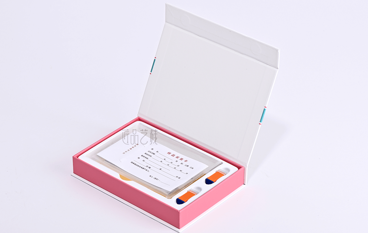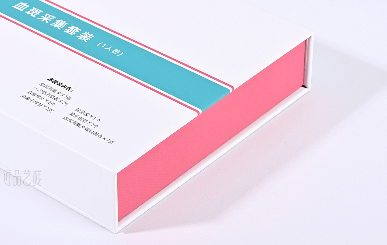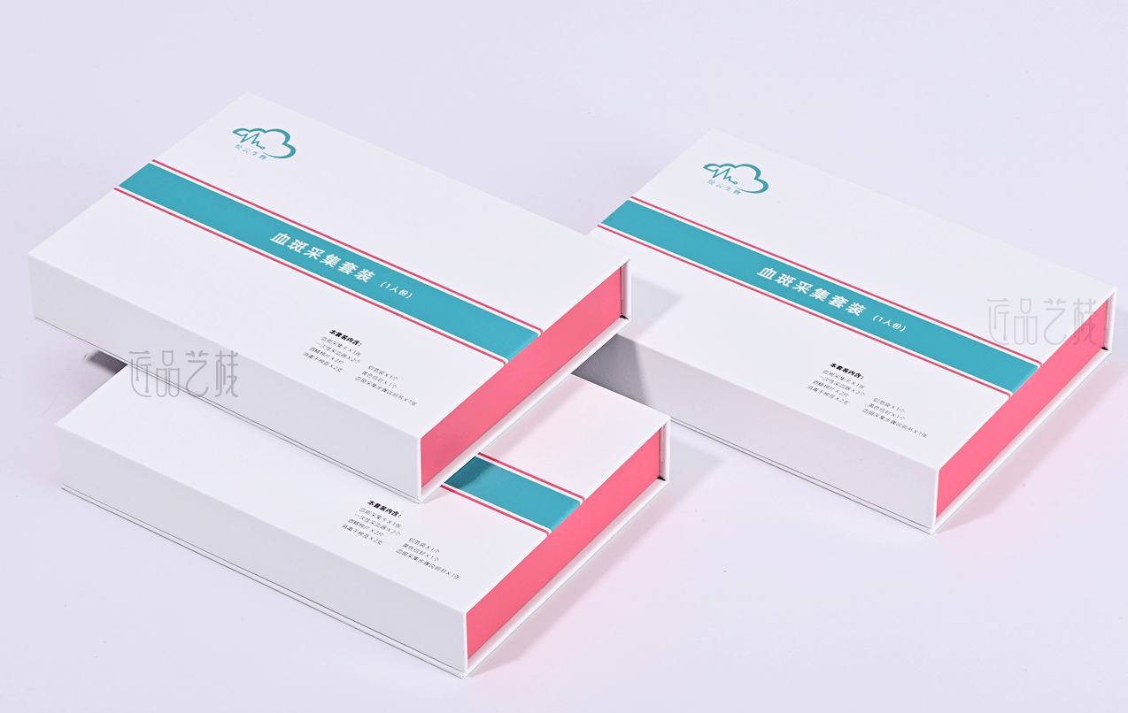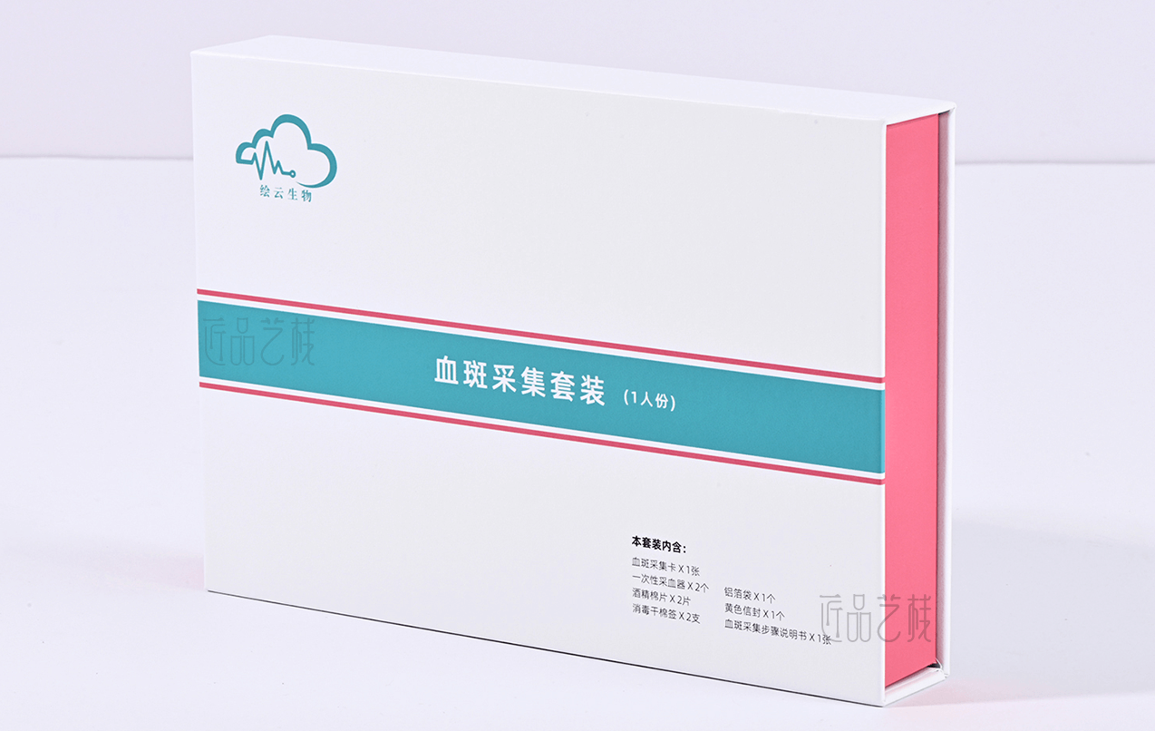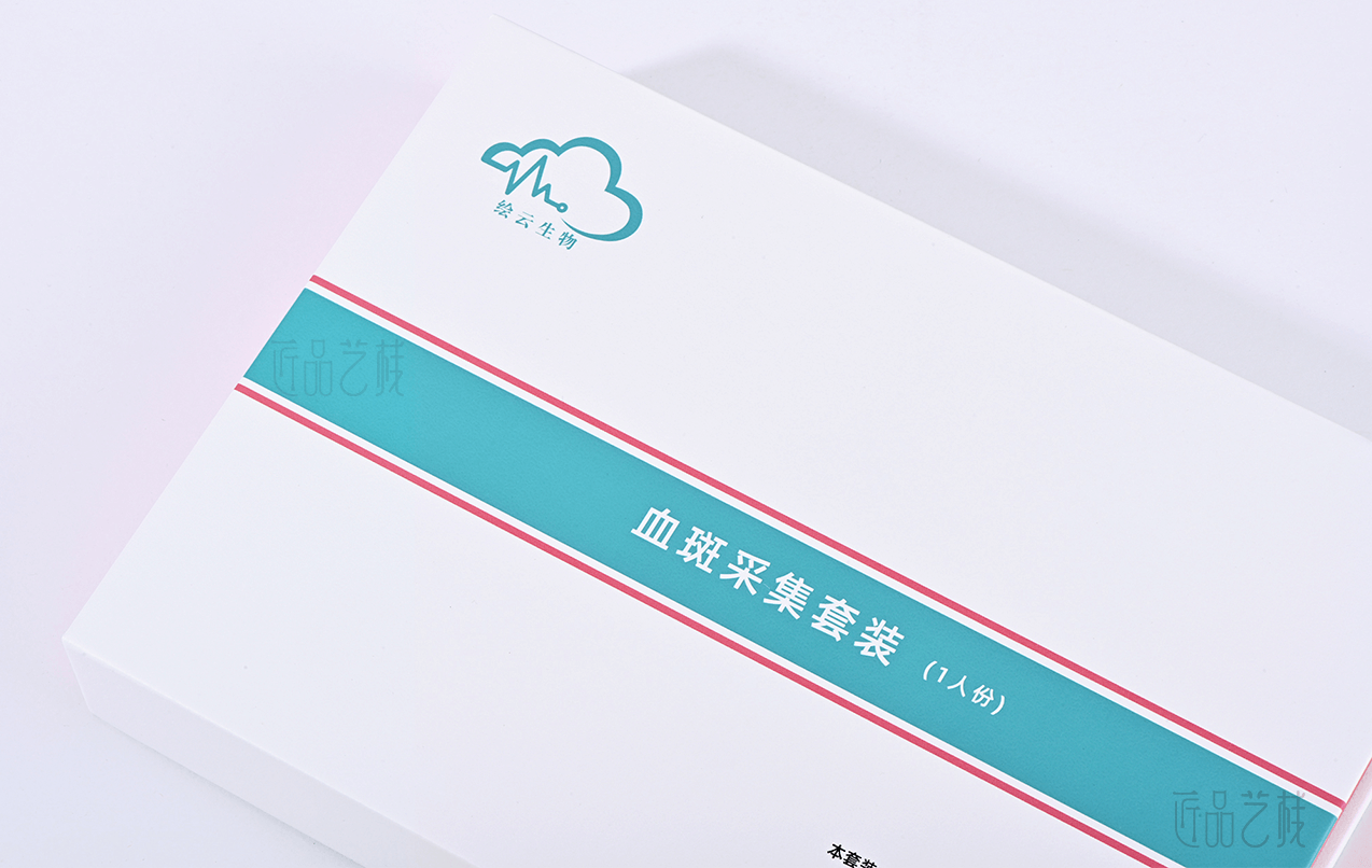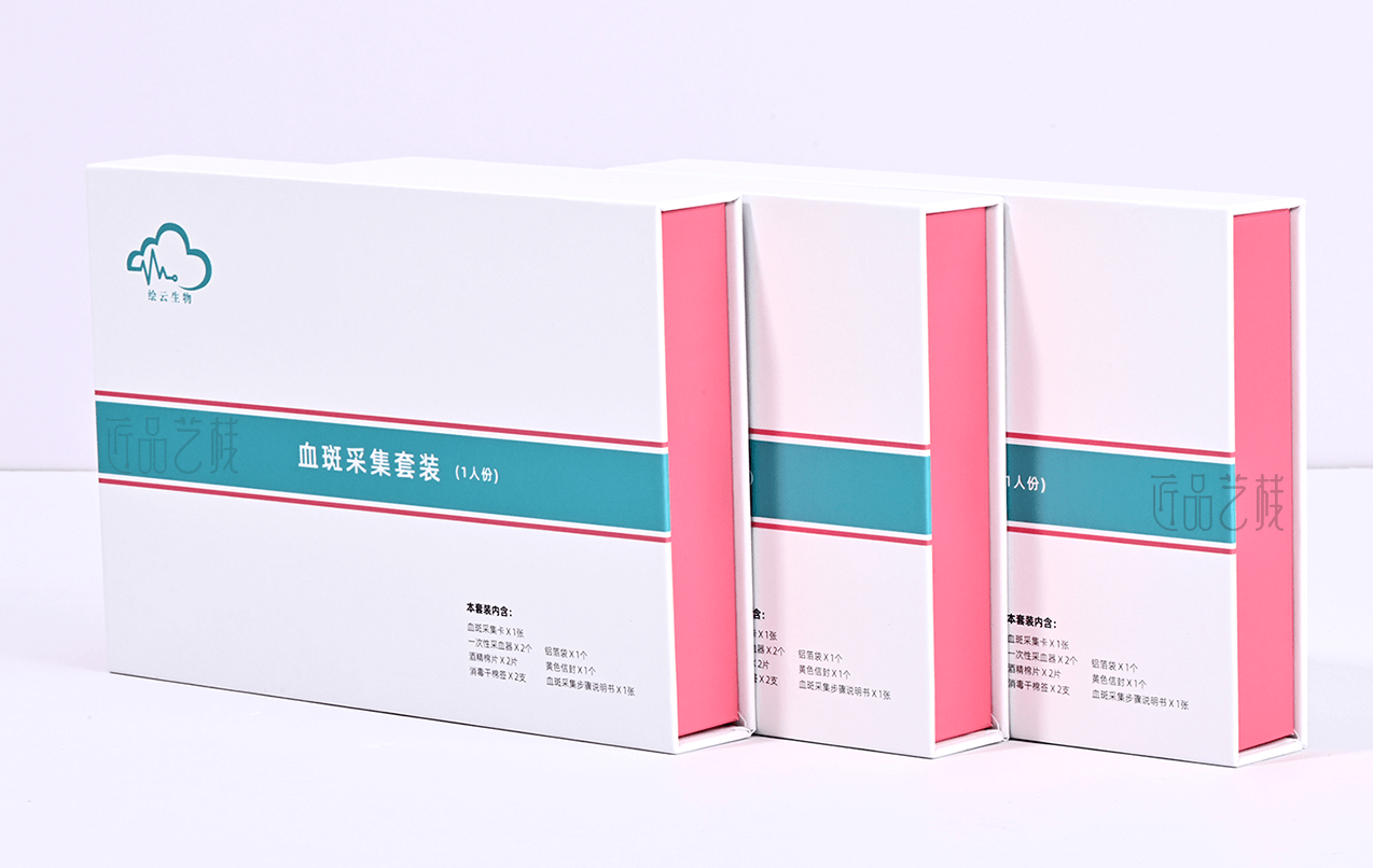 绘云生物科技,国家高新技术企业,自有一系列自主知识产权的体外诊断试剂盒、智能辅助软件和健康饮品和多项科研和医学检验服务。针对该血斑采集试剂盒定位为高端检测人群和渠道,佳润隆包装&匠品艺栈在设计印刷中,采用硬卡精装结构模式,运用科技蓝和血斑粉红为主色搭配,以简约的风格和精致的材质、工艺,打造与绘云生物科技合作中又一优秀包装设计印刷案例。