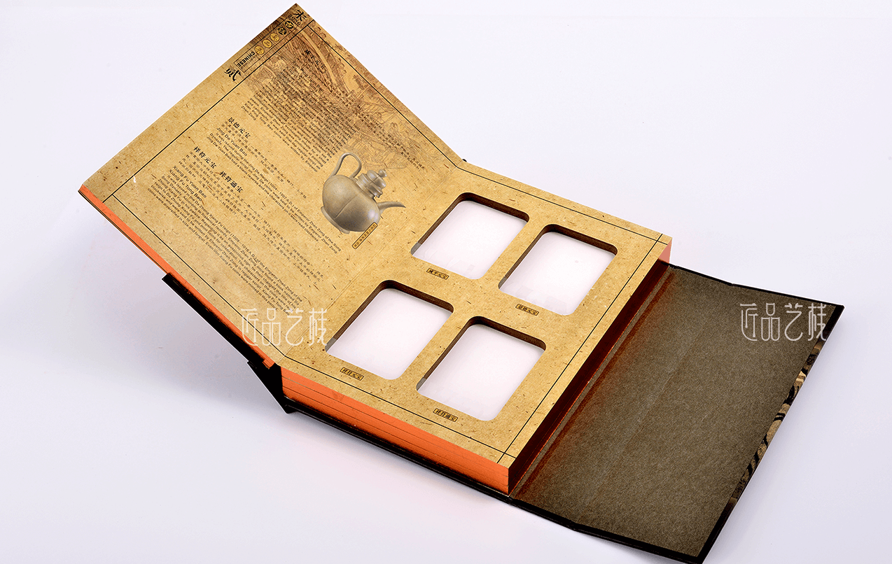 古钱真品集包装盒套装定制,是一款专为古钱币收藏而定制的包装盒,采用蝴蝶活页精装的创意结构,以中国古典元素结合双开门的形式,以及金边烫印等工艺,使整个包装盒呈现出古典、奢华和浓浓的历史感,体现出所收藏古币的高端品质感和文化价值。