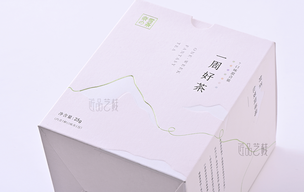 一周好茶,是奈雪的茶特别选择了深受年轻消费者喜爱的花茶品类,以杯杯专属新意不重样的理念,带来更加专注且丰富的产品升级,在其产品包装纸盒的订做上,亦采用简约新潮的创新纸张,配合简约的印刷色彩、烫金和凸印工艺,使其呈现出现代简约、深受年轻消费者喜爱的包装风格。